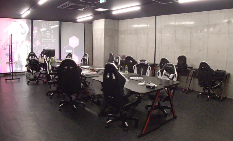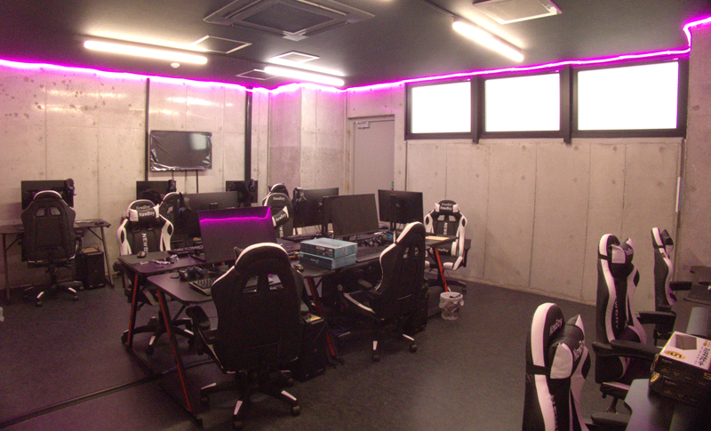 eスポーツや動画編集をプロから学べる就労継続支援B型事業所。黒を基調にしたスタイリッシュな空間と間接照明で、作業に集中できる環境を実現しました。就労支援の場とは思えない近未来感あふれるデザインで、新しい「学びと作業」のスタイルを提供します。